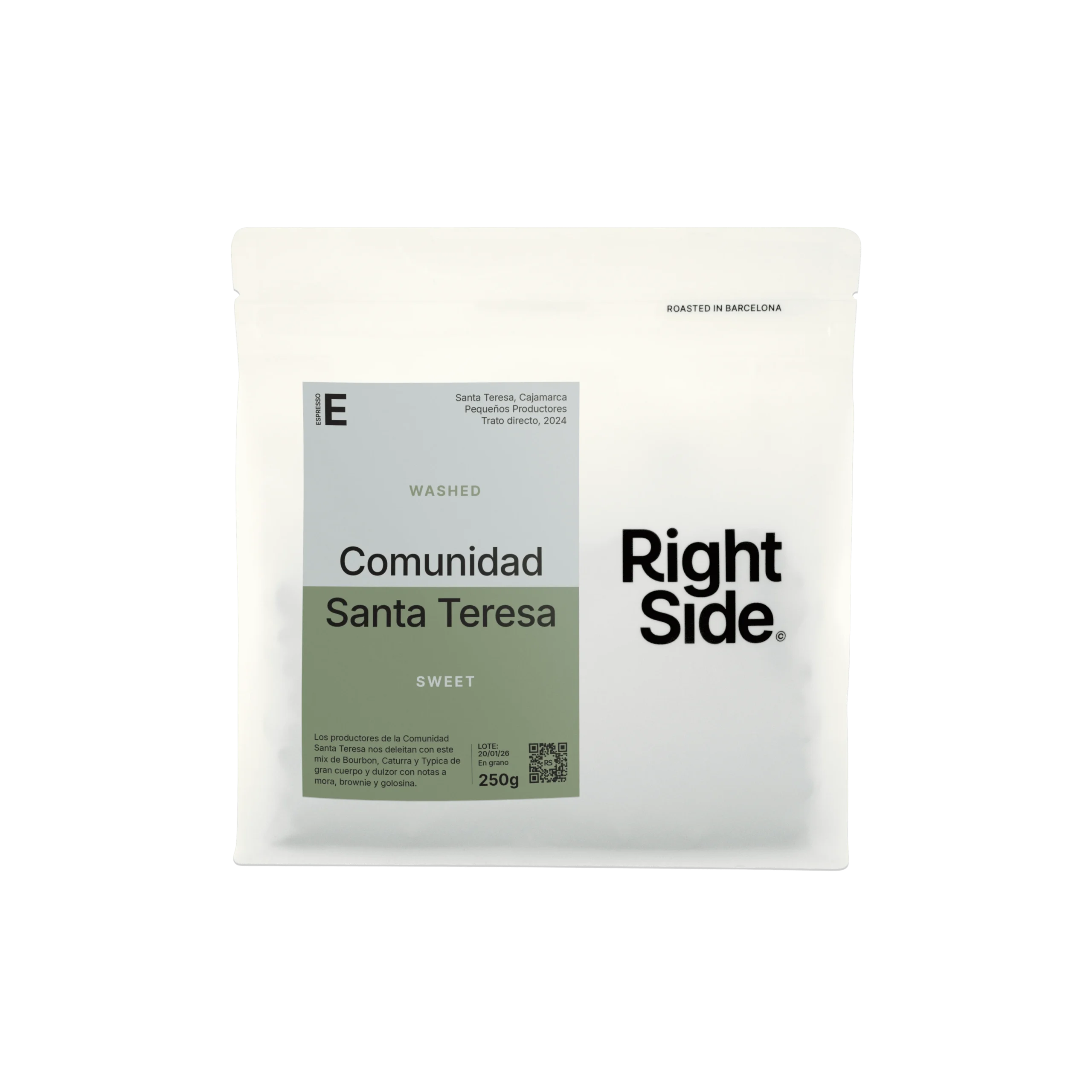 Café de Especialidad RightSide. Los productores de la Comunidad Santa Teresa nos deleitan con este mix de Bourbon, Caturra y Typica de gran cuerpo y dulzor con notas a mora, brownie y golosina.